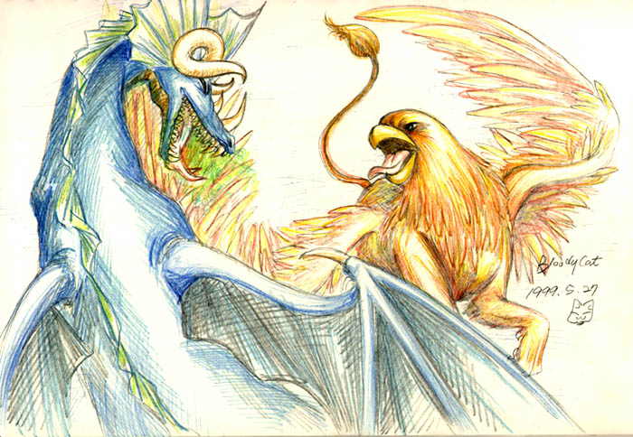 대접전이라니깐 엄청난 것 처럼 느껴지는... 하여간 드래곤 한마리하고 그리폰 한마리가 험악한 표정으로 서로 으르렁대는 그림입니당 아...빨리 컴퓨터로 색칠을 해야 하는뎅... 여건상... 이것두 색연필 색칠입니당...쩝 그럼, 잘 봐주세요~ MEOW♬ BloodyCat