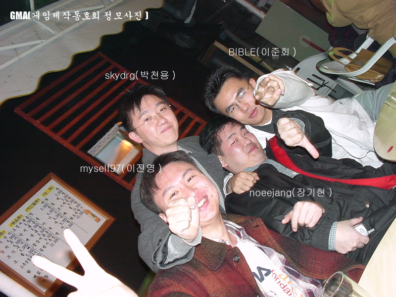 저번 게제동 정모사진입니다만....흐.. 빠데리가 없었던 관계로 딱한장 뿐입니다. 흐흐..딱 4명 합동 엽기 사진입니다. 잘 보세여...쿠쿠..
